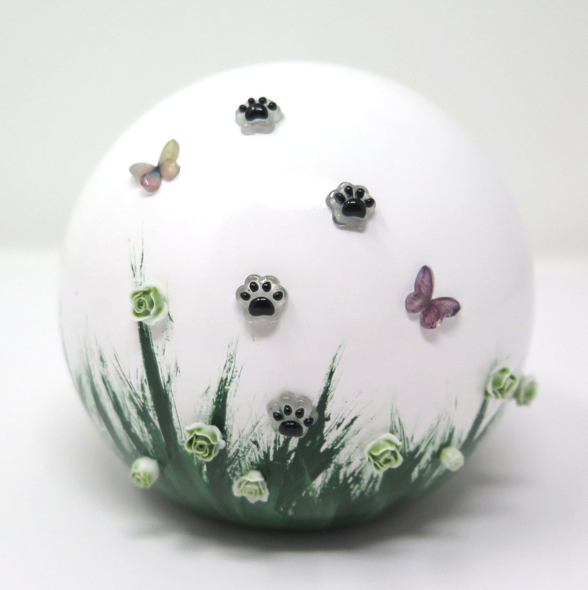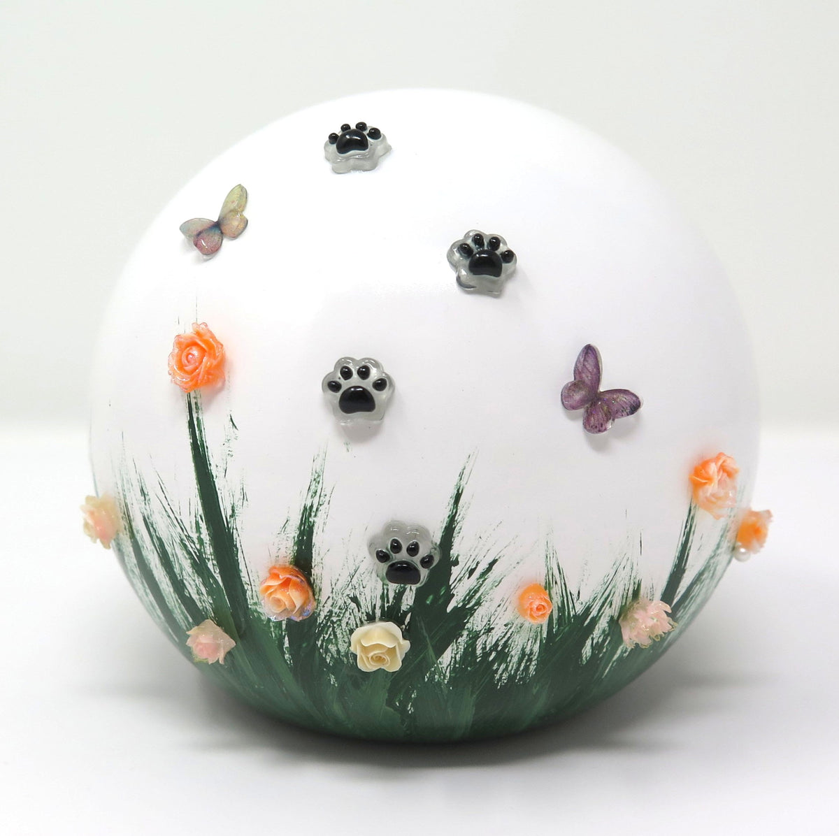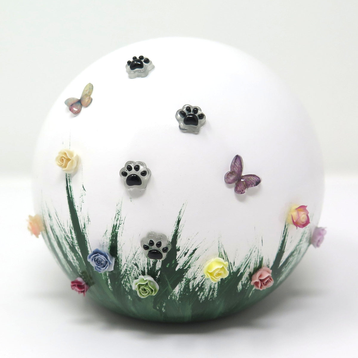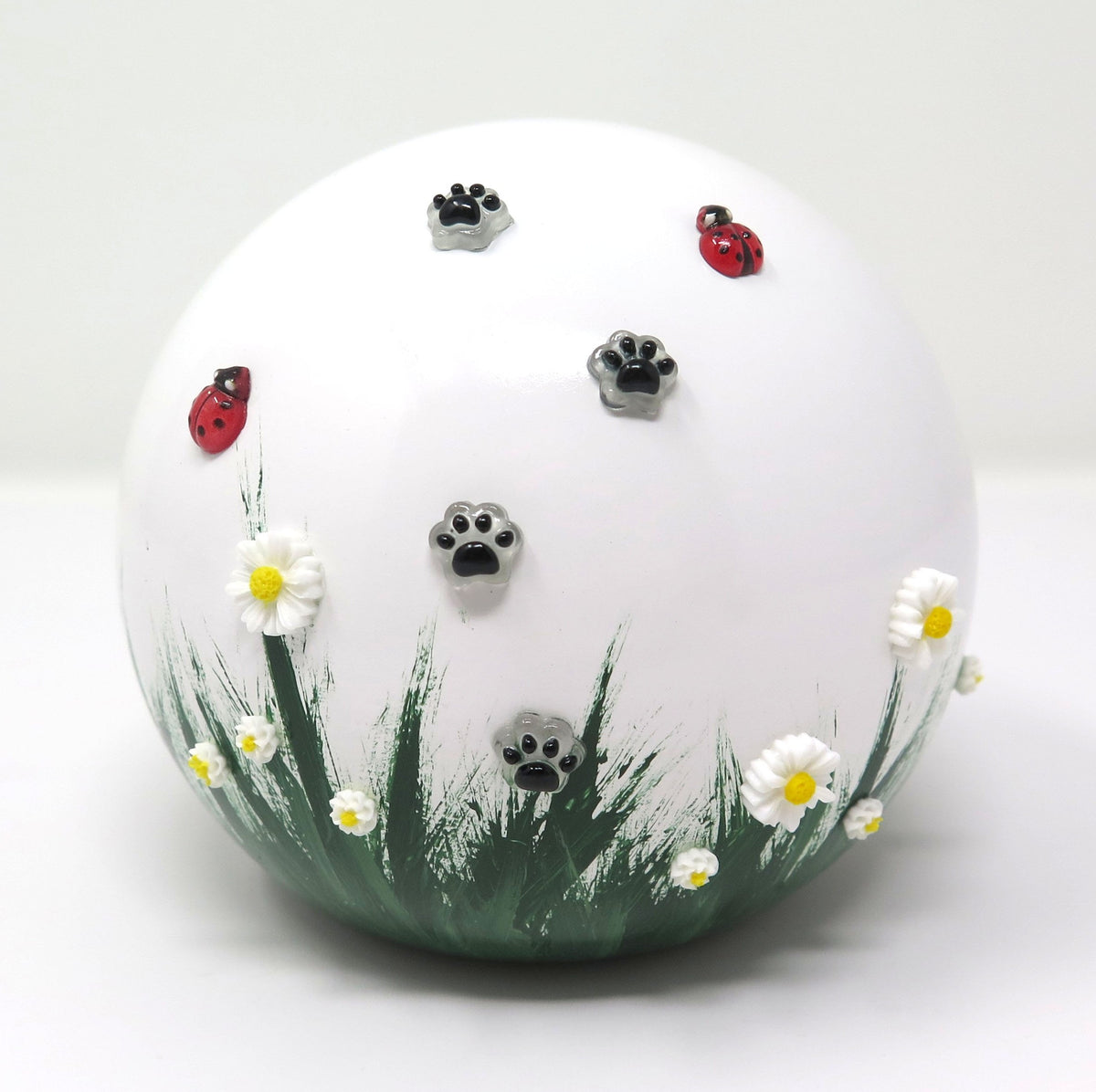 Kugelurne aus handgefertigter Keramik in unzähligen Größen und Motiven, auch als Kleintierurne geeignet.