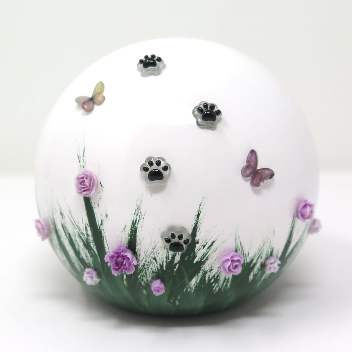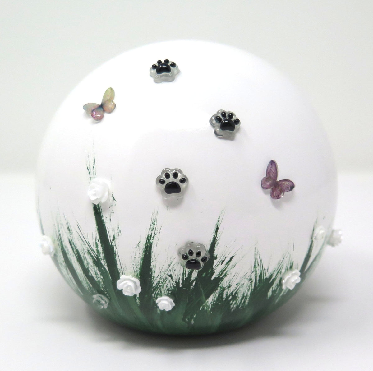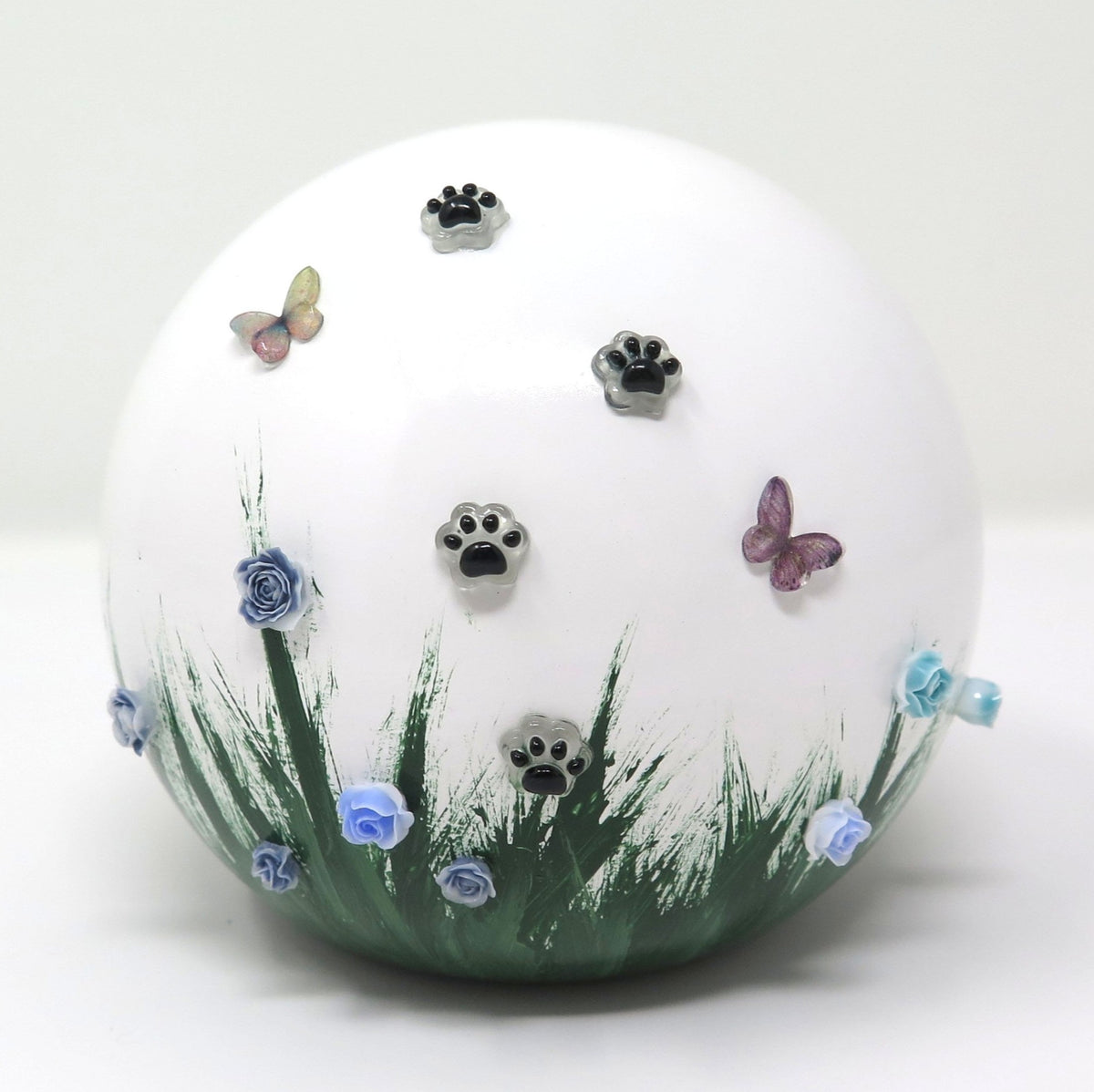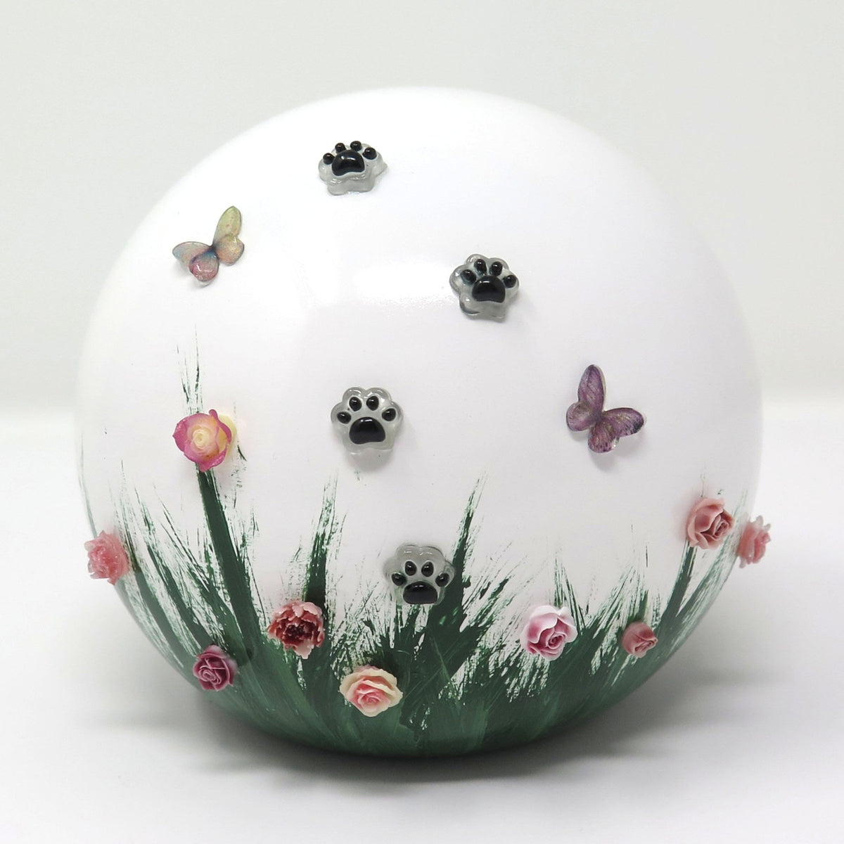 Kugelurne aus handgefertigter Keramik in unzähligen Größen und Motiven, auch als Kleintierurne geeignet.